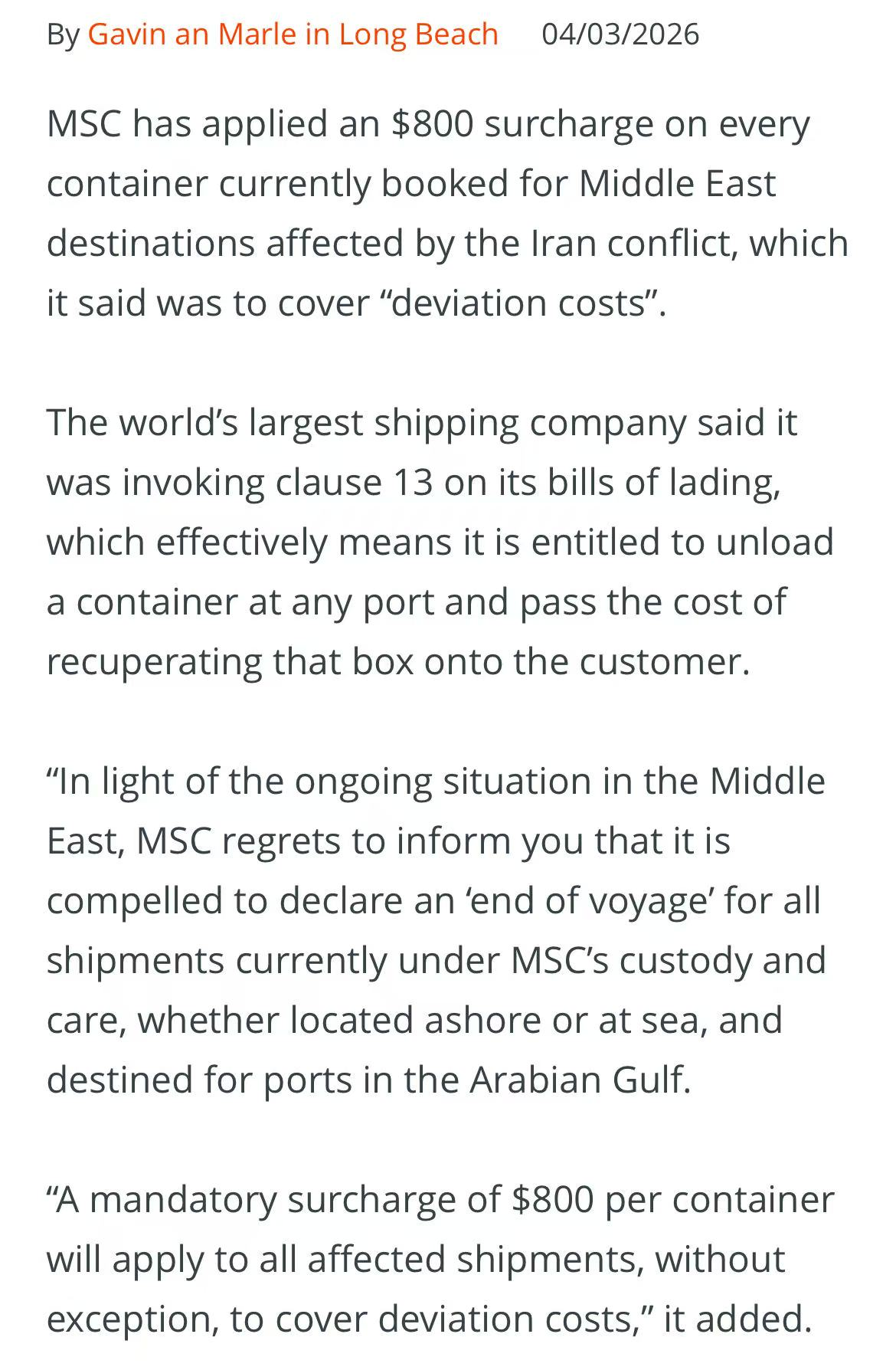 更关键的是,MSC宣布启动提单第13条条款,对所有在途及已抵港的目的地为波斯湾港口的货物,执行“航程终止”。这意味着,船公司有权在任何安全港口卸下货物,后续提货、转运及所有相关费用(装卸费、仓储费等)全部由货主承担。