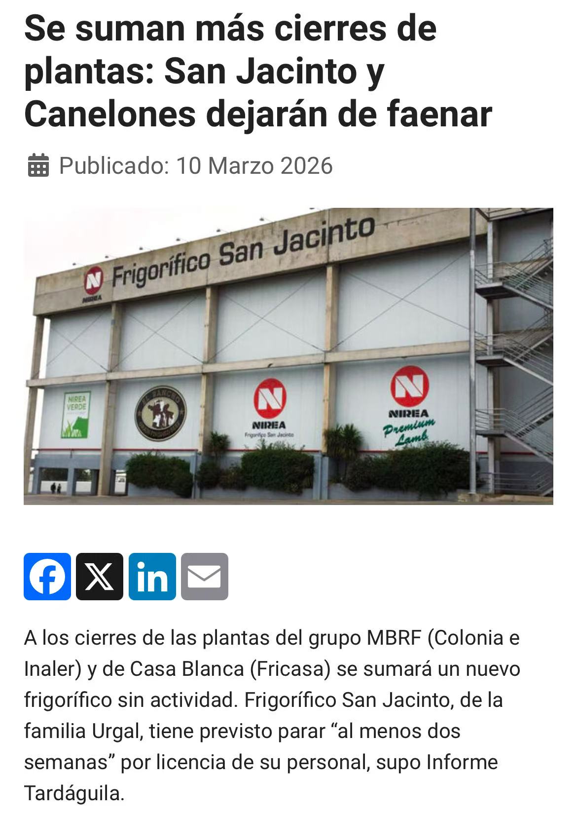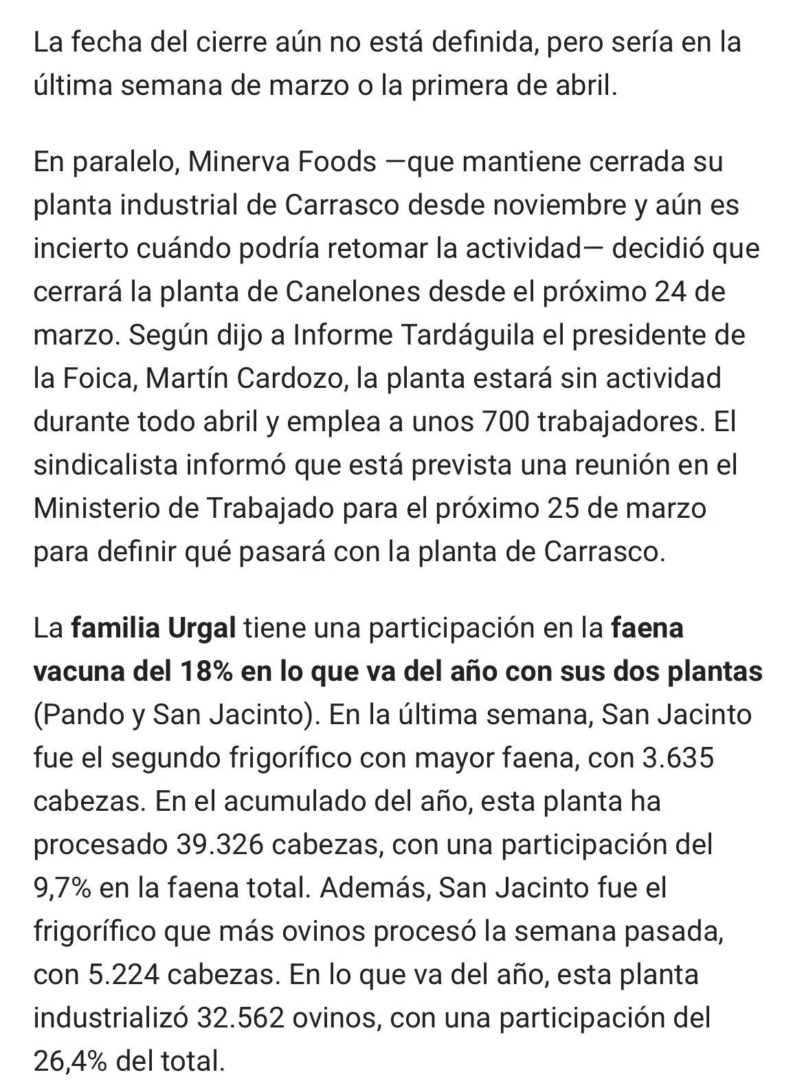 继MBRF旗下2厂、55厂、58厂停产后,又有两家核心工厂官宣停产:San Jacinto厂(344厂)计划3月最后一周或4月第一周起停产至少两周,该厂今年已累计屠宰牛3.9万头,占全国总量9.7%,上周屠宰量位列全国第二;Minerva旗下Canelones厂(8厂)自3月24日起停产至4月底,涉及700名员工,该厂今年累计屠宰牛2.8万头,占全国7.5%。