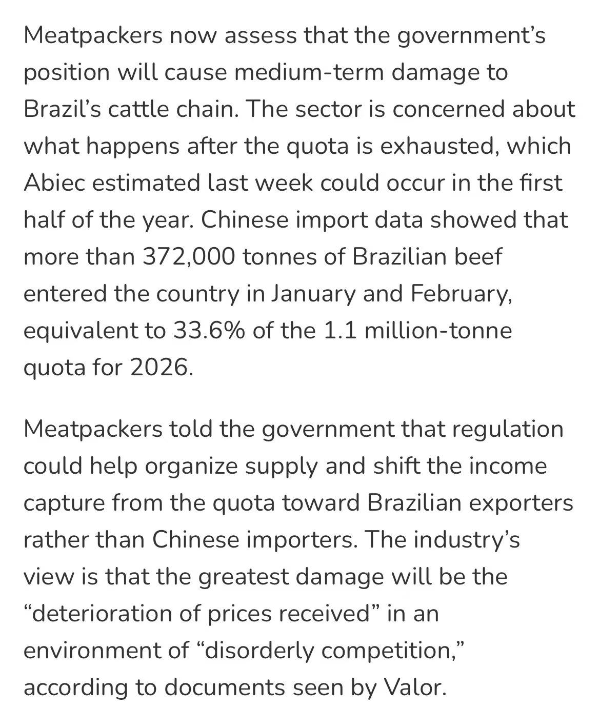 第一,配额消耗速度不会放缓。1-2月已用掉三分之一,若无官方管控,出口商大概率会继续“抢跑”,配额可能在年中或更早耗尽。这意味着下半年巴西牛肉到岸价可能因加征55%关税而大幅上涨。