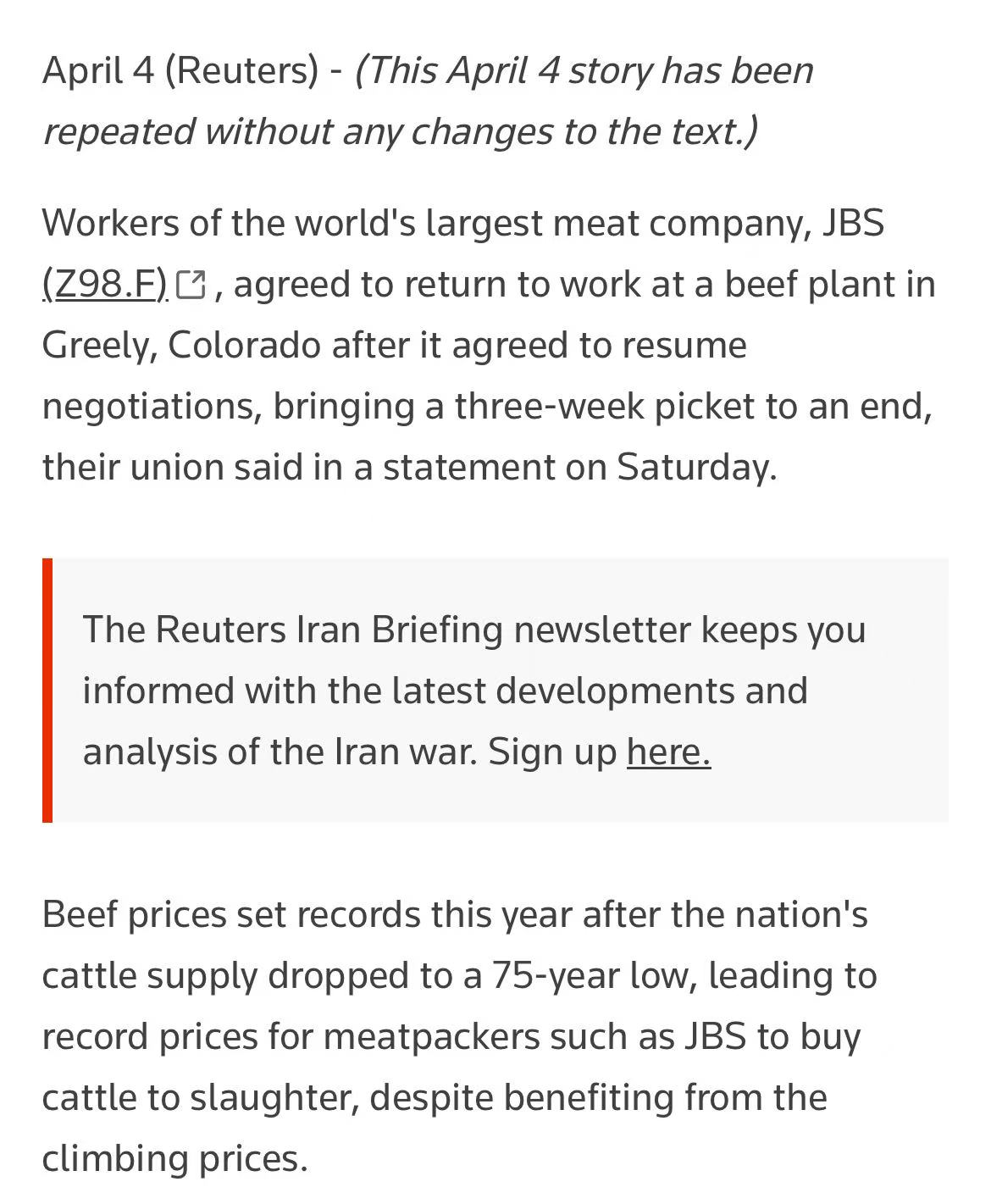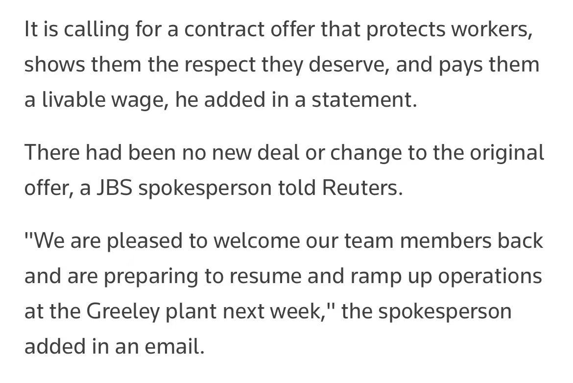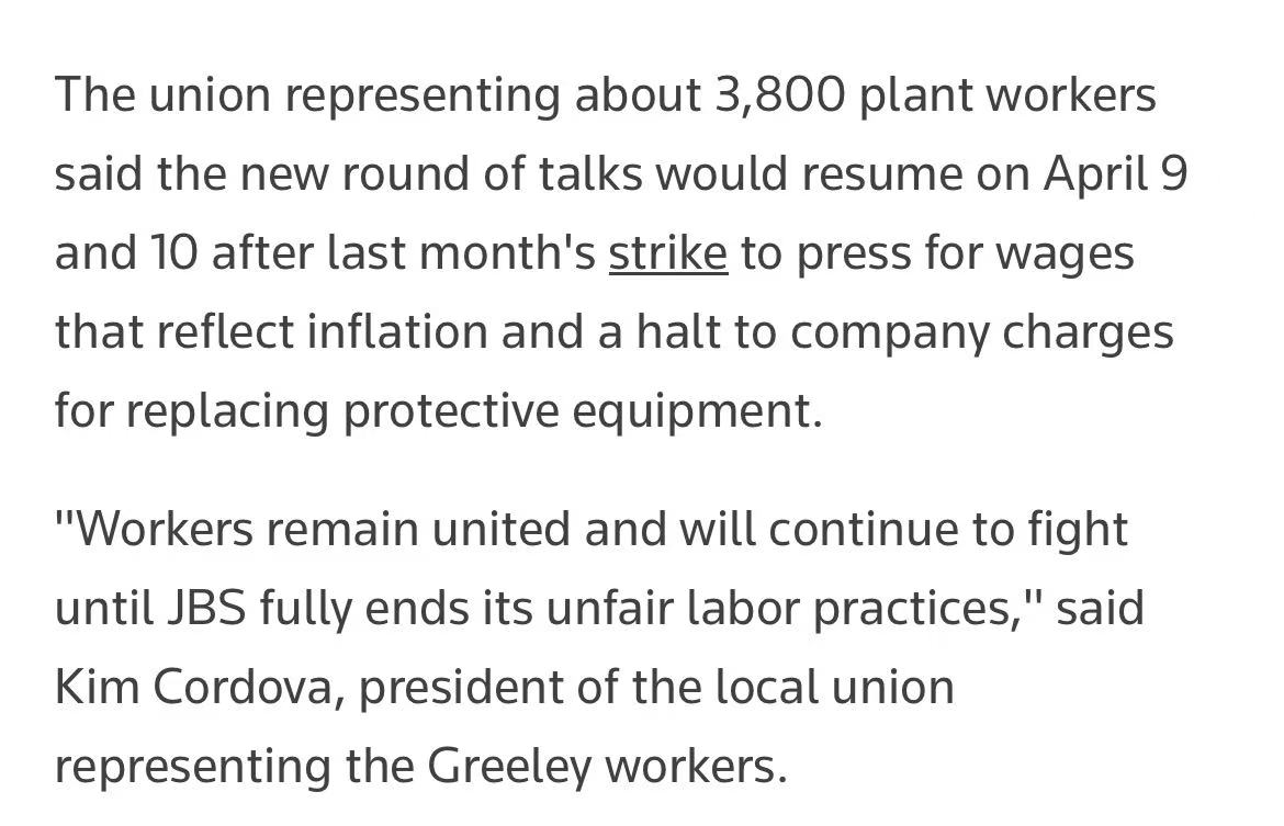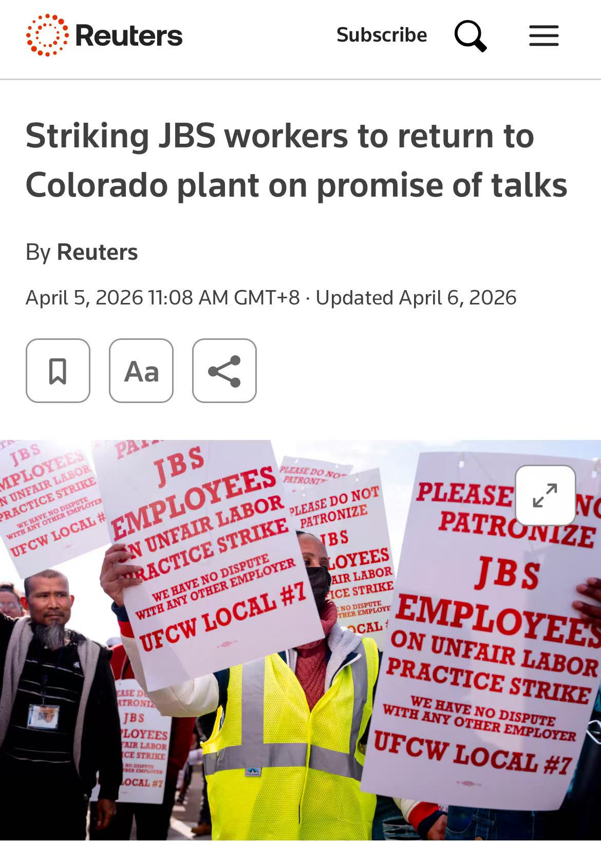 持续三周的JBS科罗拉多州格里利工厂罢工,终于在4月7日迎来转机。约3800名工人同意返岗,条件是JBS承诺恢复谈判。新一轮劳资对话定于4月9日—10日重启。