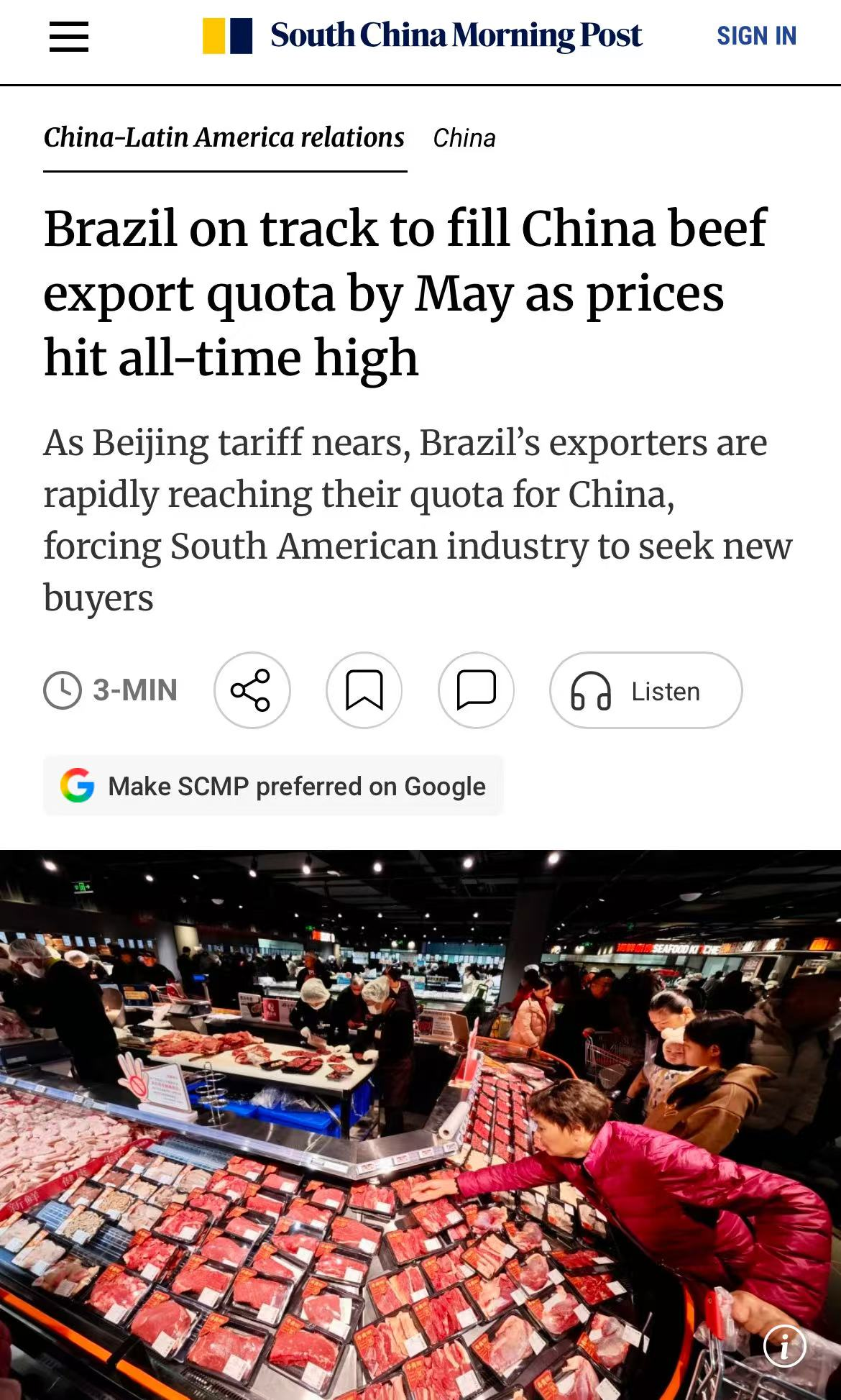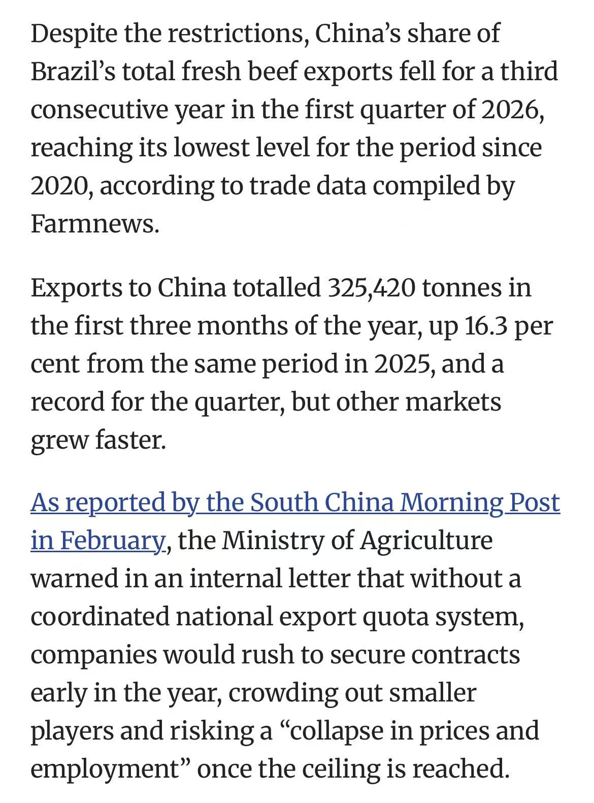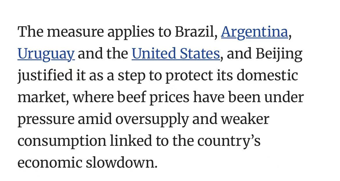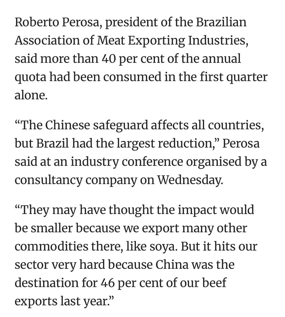 中国自今年起对超配额牛肉加征55%关税。巴西去年对华牛肉出口占其总量的46%,冲击巨大。