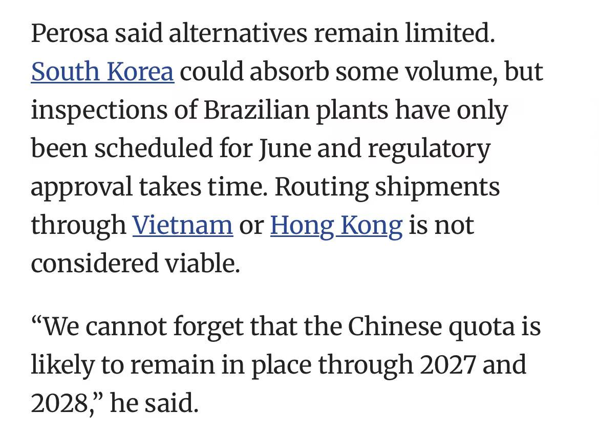 替代市场有限:韩国准入需等到6月后;越南、香港转运不可行;美国虽有意采购,但遭本国牧场主反对。
