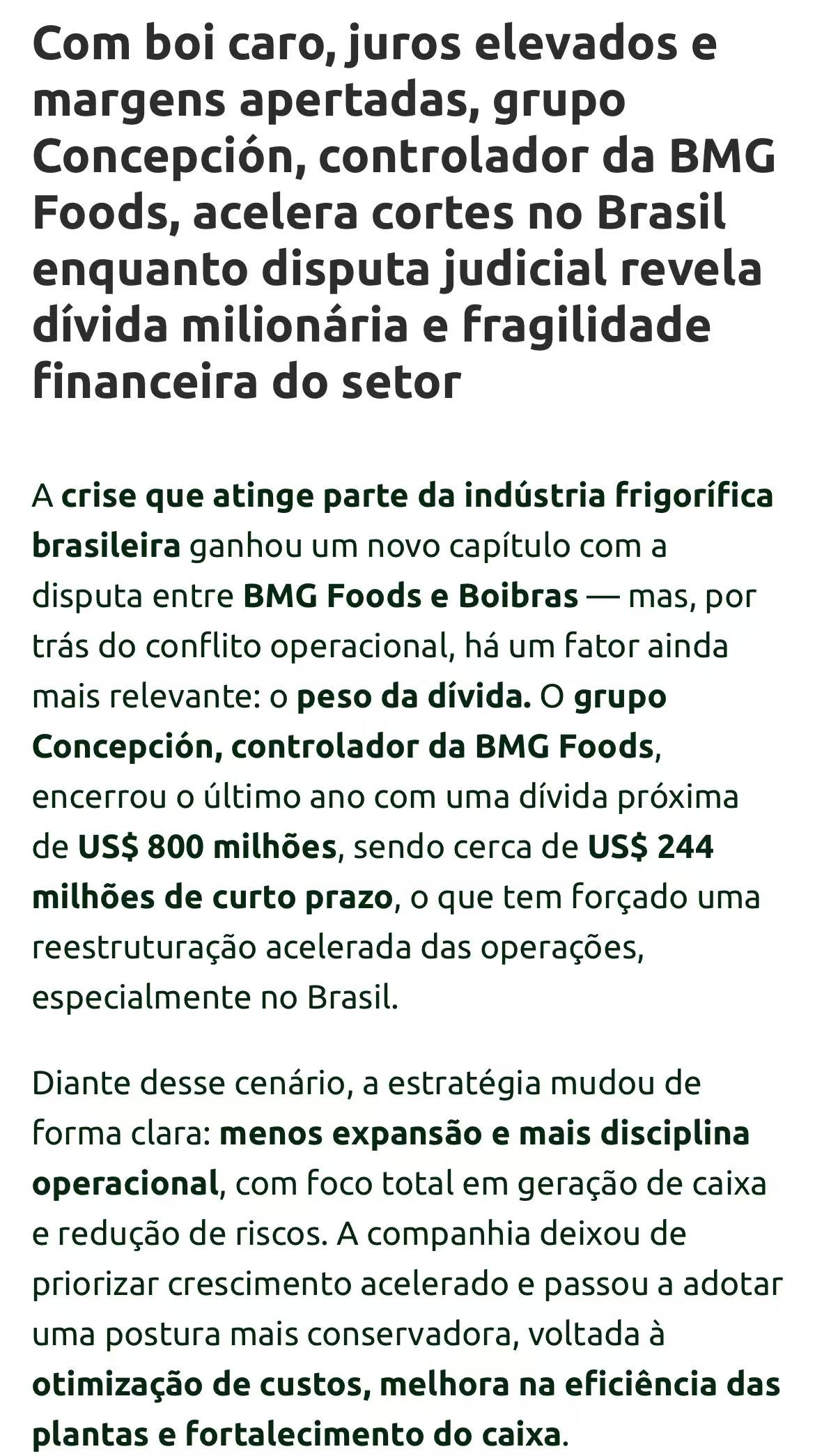 据外媒报道,巴西肉类加工企业BMG Foods正陷入债务与经营双重困境。其母公司Concepción集团截至2025年底总负债接近8亿美元,其中短期债务约2.44亿美元。在牛价高企、利率上升、利润空间持续收窄的背景下,公司被迫启动大规模业务重组。