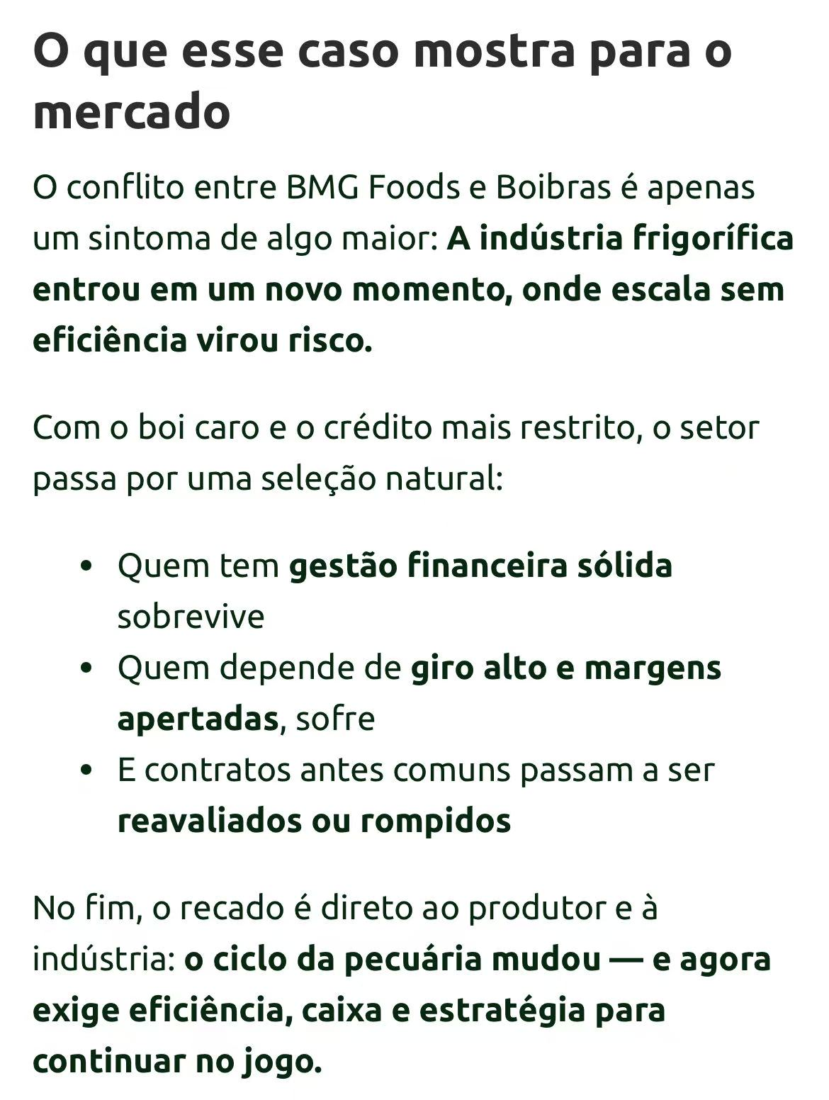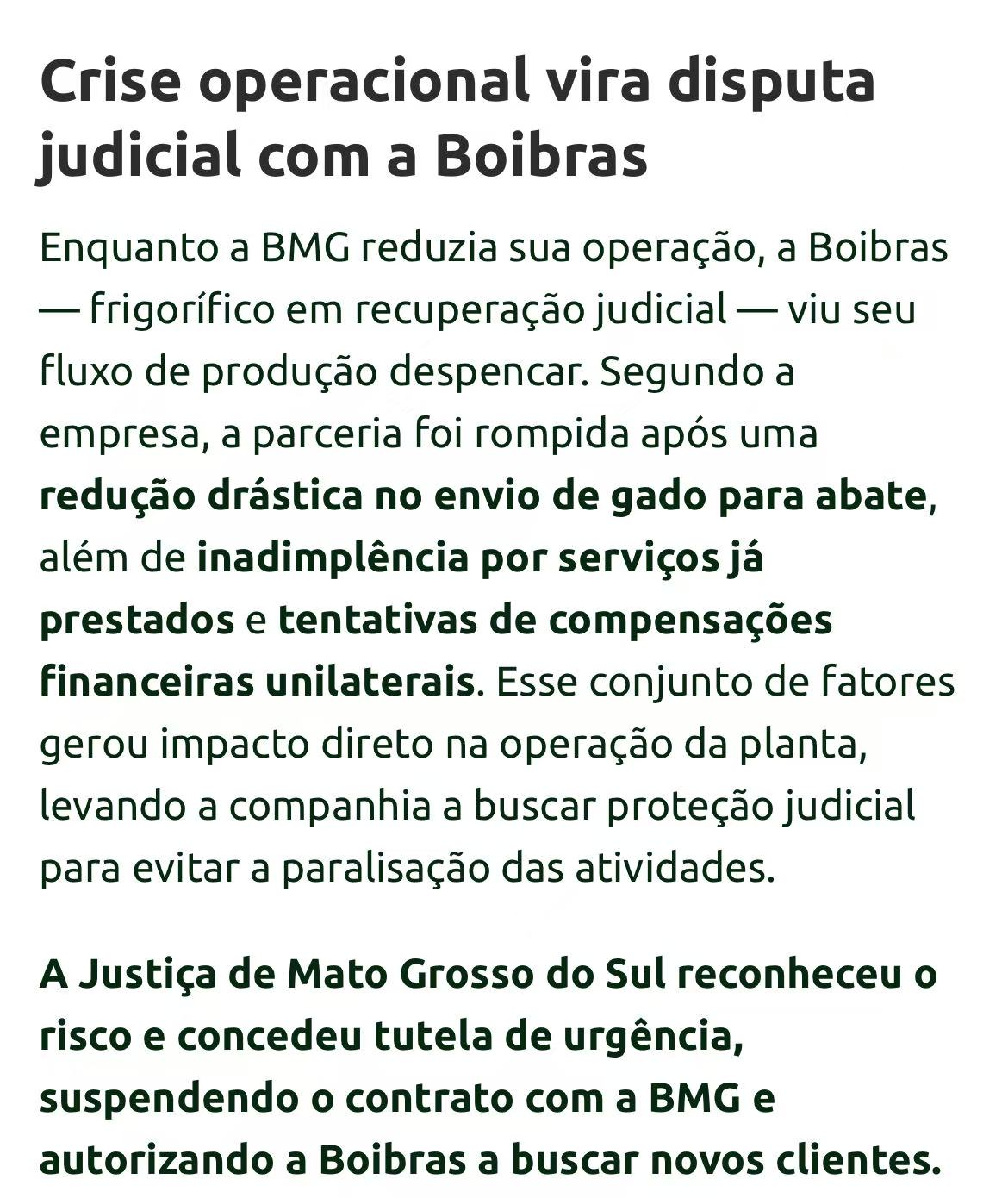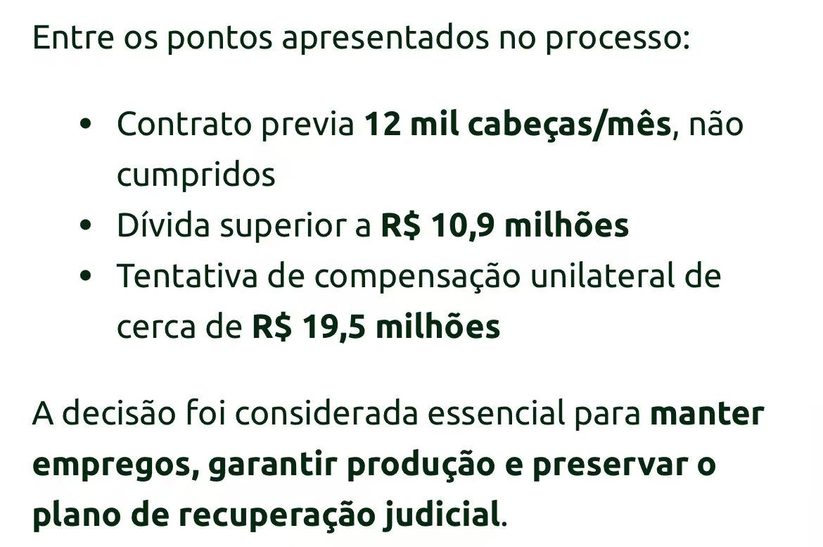 与此同时,BMG Foods与处于司法重整期的Boibras(2782厂)爆发合同纠纷。Boibras指控BMG Foods未能履行每月1.2万头的送宰协议,拖欠服务费超1090万雷亚尔,并试图单方面以约1950万雷亚尔进行财务抵扣。南马托格罗索州法院已裁定暂停双方合同,允许2782厂另寻客户。