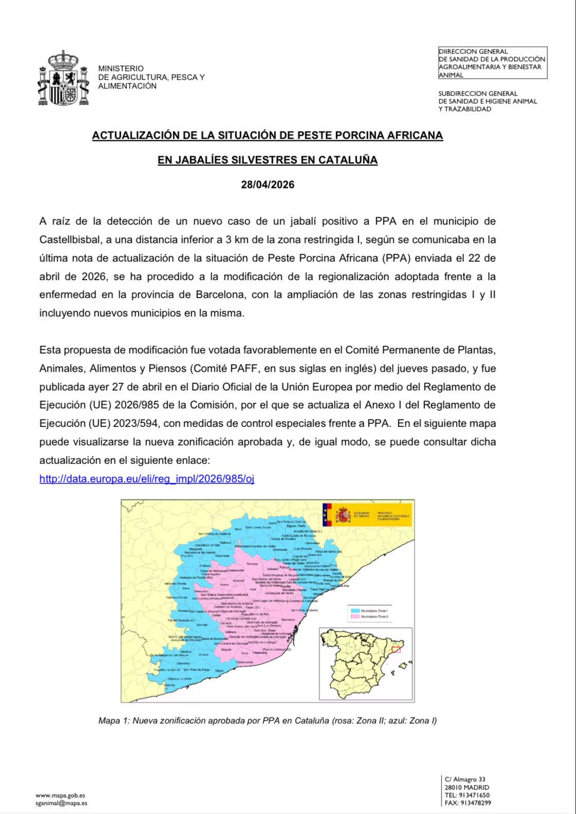 这一调整方案已经在上周四的欧盟植物、动物、食品和饲料常设委员会会议上获得表决通过,并于4月27日通过欧盟《(EU) 2026/985号实施条例》正式公布。在加泰罗尼亚地区,受限制的市镇数量已增至19个,具体管控措施包括:严格限制进入自然环境、禁止狩猎以及加强野猪尸体搜寻等。