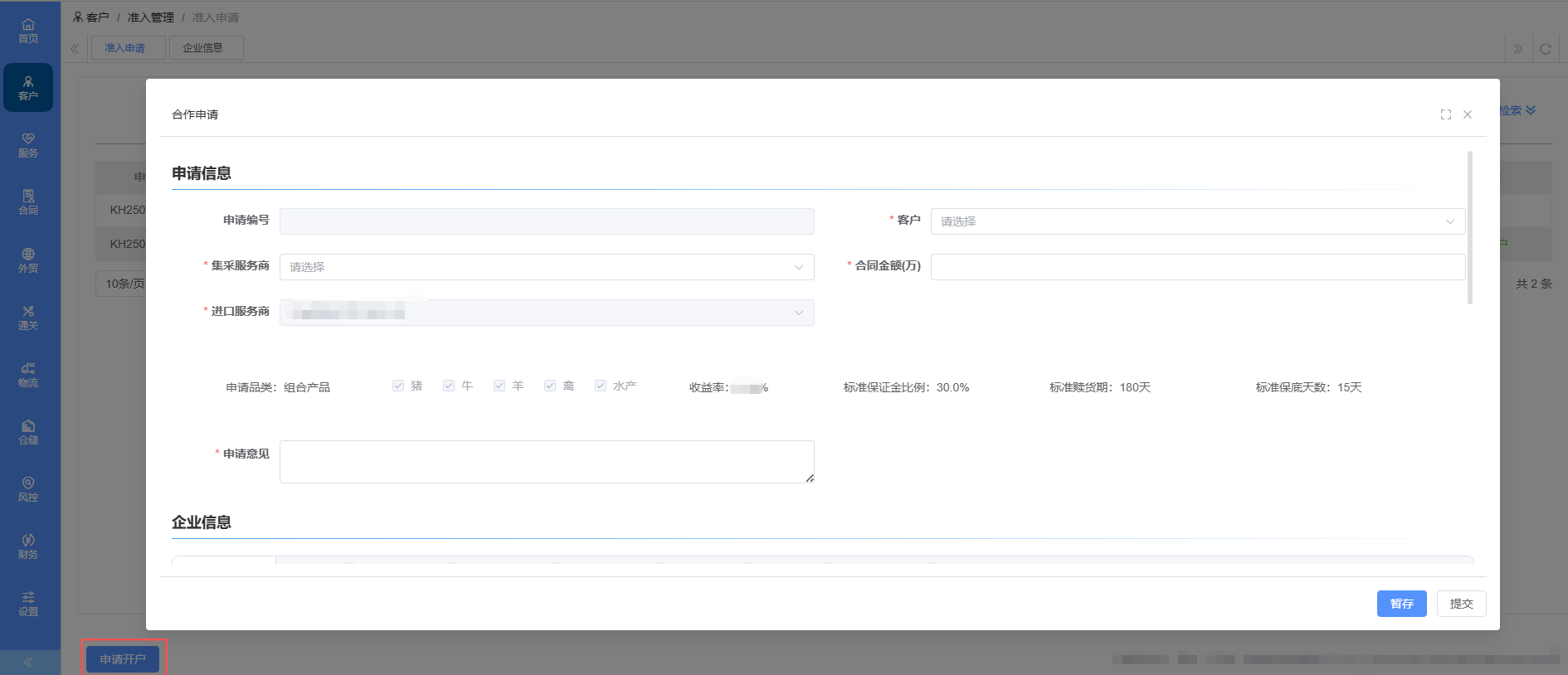 1.如果生产/贸易企业需要通过集采方式进行订柜,需要先向集采服务商提交开户申请。打开控制台“客户-准入管理-准入申请”菜单,点“申请开户”,填写准入申请。