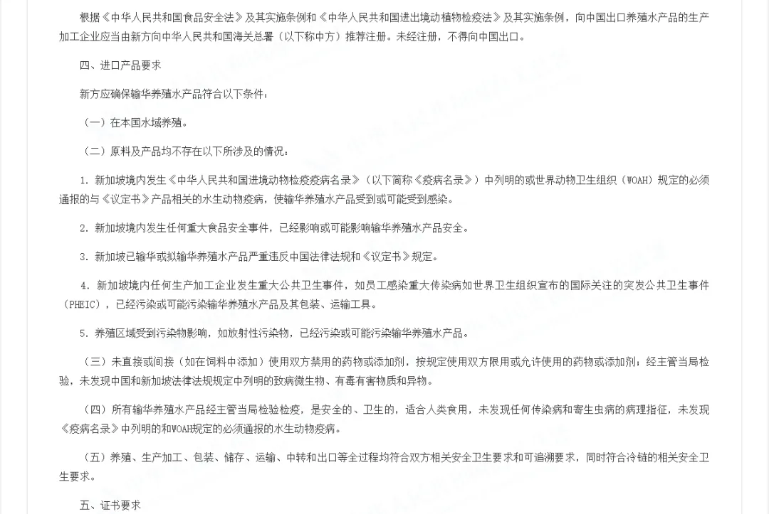 (三)《中华人民共和国海关总署与新加坡共和国永续发展与环境部关于新加坡输华养殖水产品的检验检疫要求议定书》(以下简称《议定书》)。