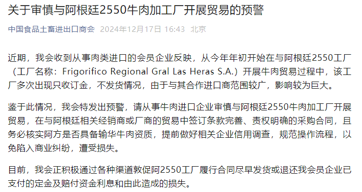 今日,【中国食品土畜进出口商会】于16点43分发布关于审慎与阿根廷2550牛肉加工厂开展贸易的预警的通知,请相关从业人员务必引起重视!