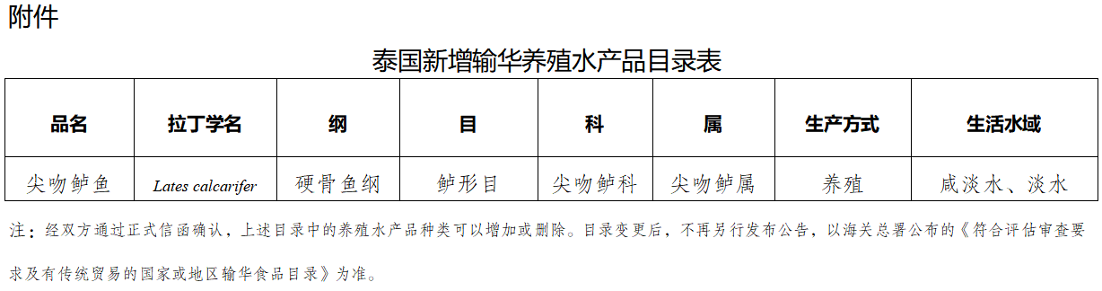 养殖水产品,是指人工养殖的、供人类食用的水生动物产品及其制品、水生植物产品及其制品,不包括《濒危野生动植物种国际贸易公约》(CITES)附录或中国国家重点保护野生动物名录所列物种、活水生动物及水生动植物繁殖材料。泰国新增输华养殖水产品目录表见附件。