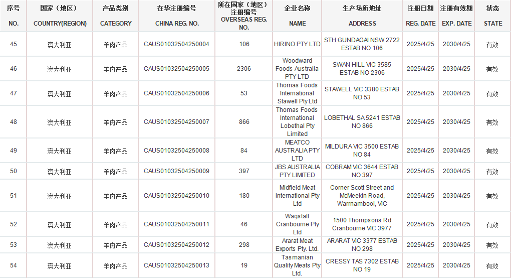 海关总署新增澳大利亚10家羊肉生产企业自2025年4月25日及之后生产的符合中国要求的羊肉产品输华。注册编码如下:106、2306、53、866、84、397、180、46、298、19。