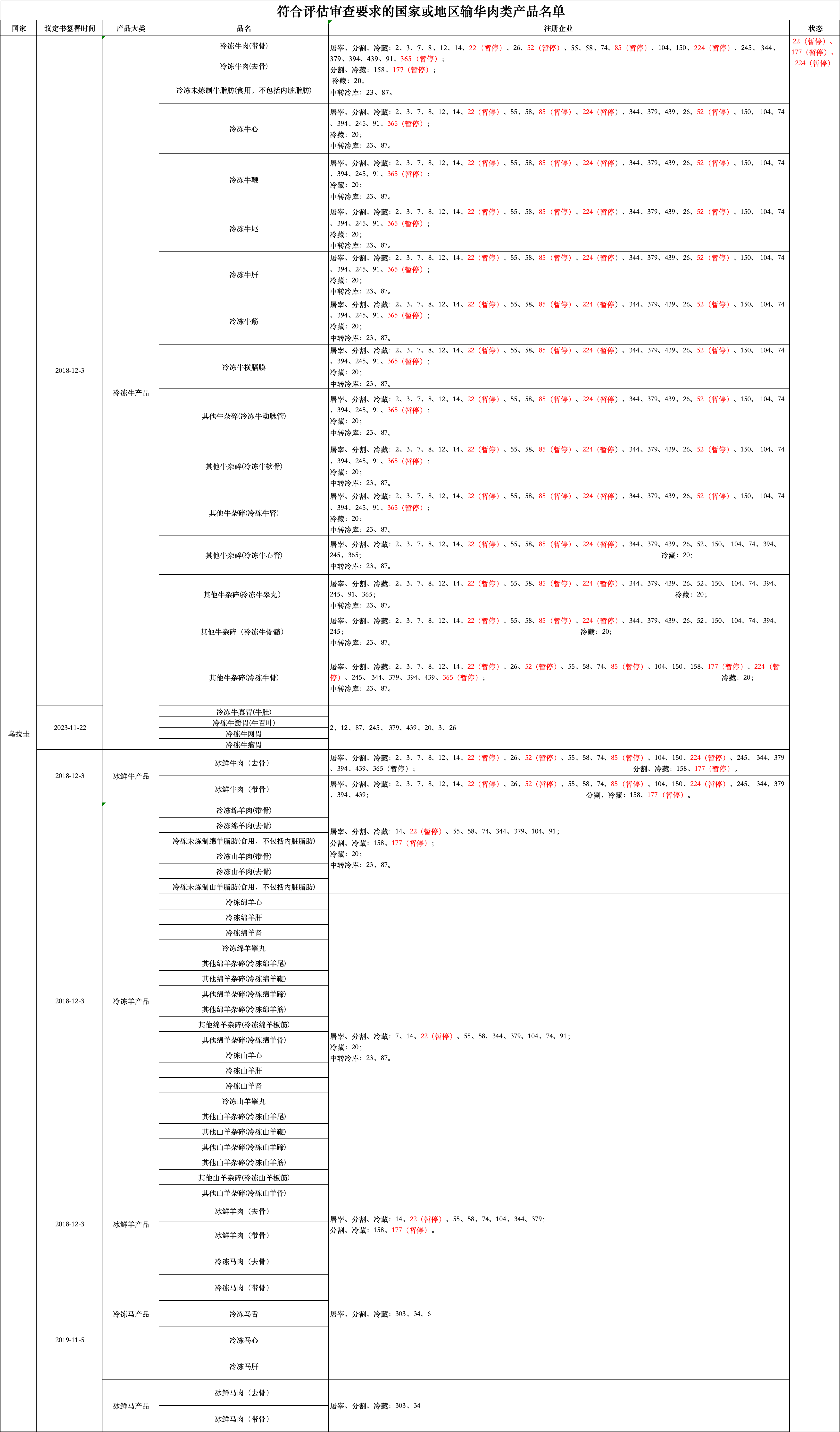 近日,海关总署更新《符合评估审查要求的国家或地区输华肉类产品名单》: