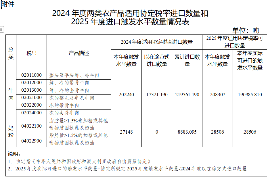 (关于2025年自澳大利亚进口两类农产品触发水平数量的公告)