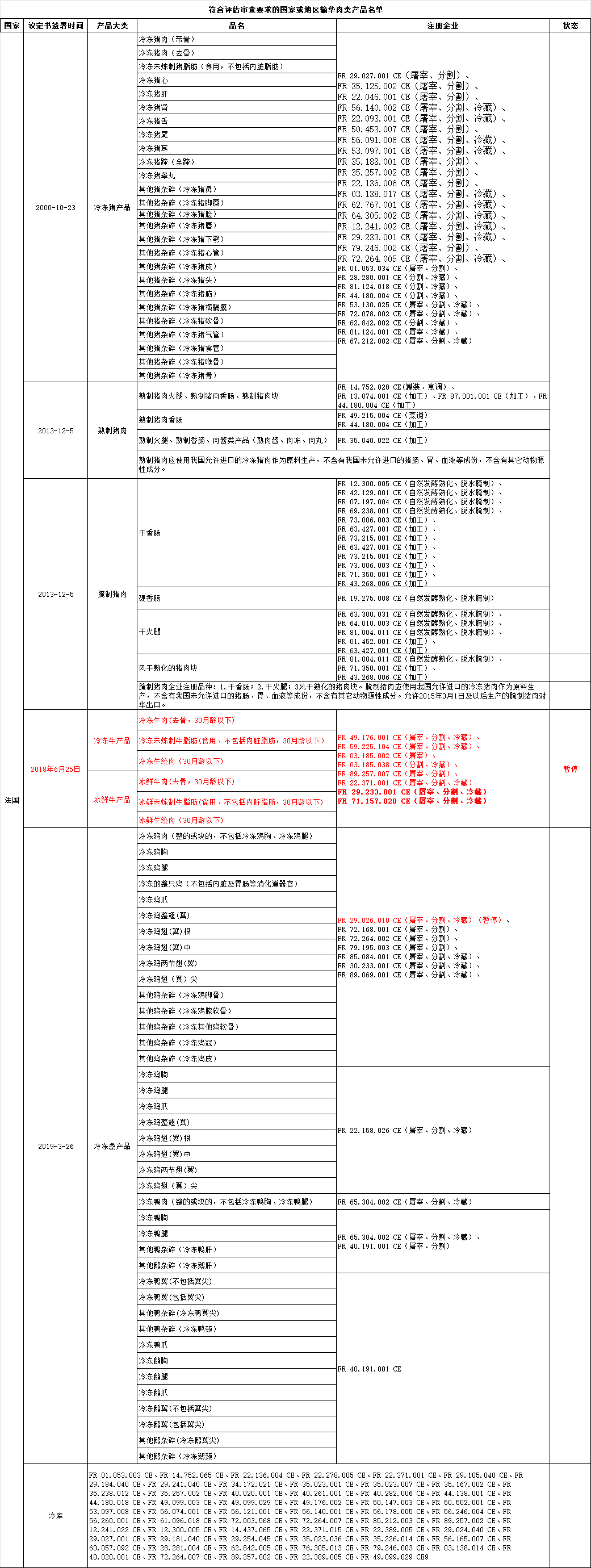 新增法国1家禽肉冷库FR 49.099.029 CE9自2025年6月5日及之后生产/贮存的符合中国要求的肉类产品输华。