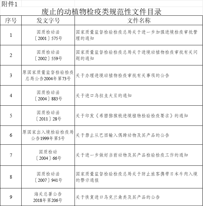 (关于废止和宣布失效部分动植物检疫类规范性文件的公告)