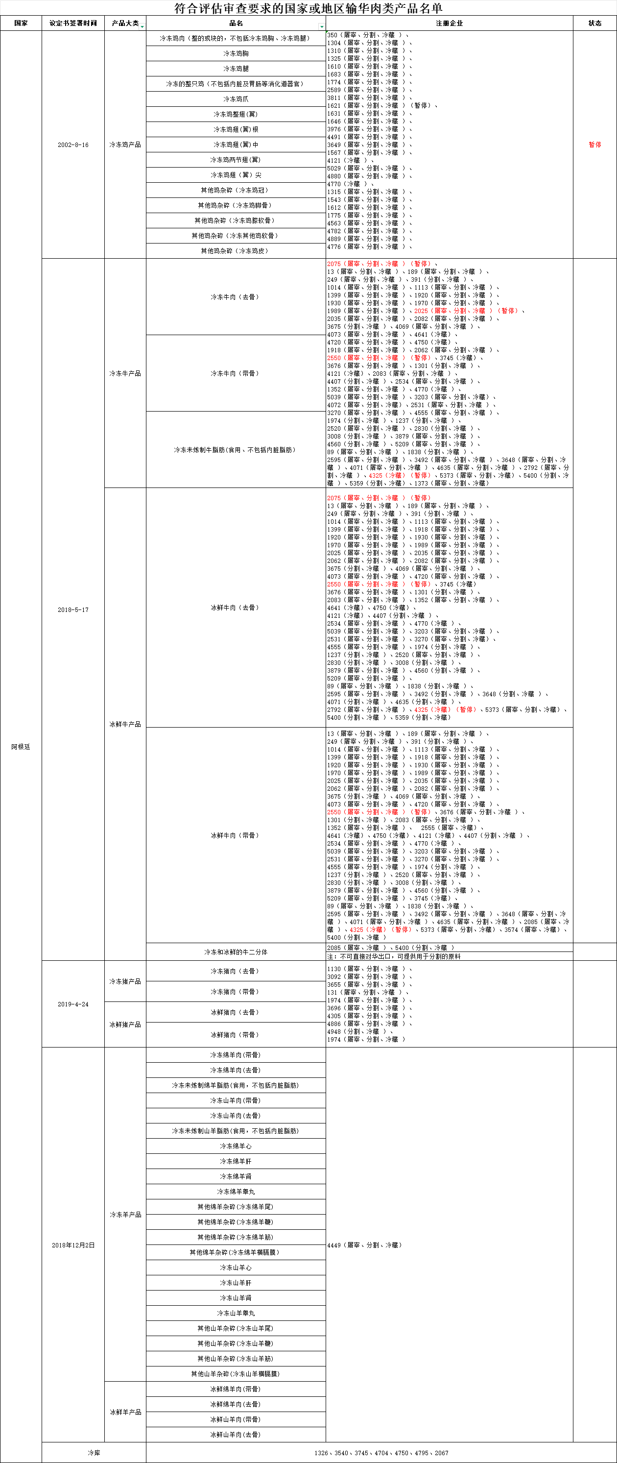 近日,海关总署更新《符合评估审查要求的国家或地区输华肉类产品名单》: