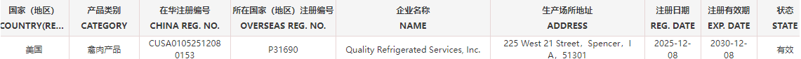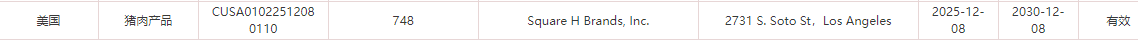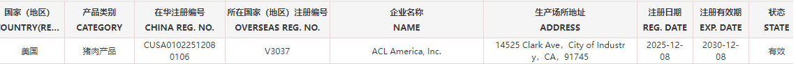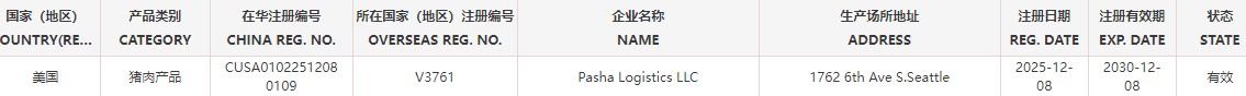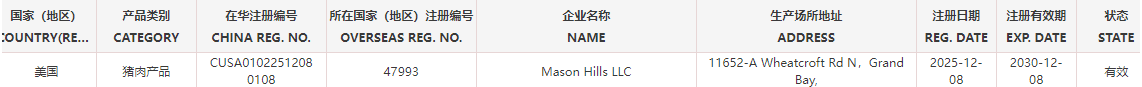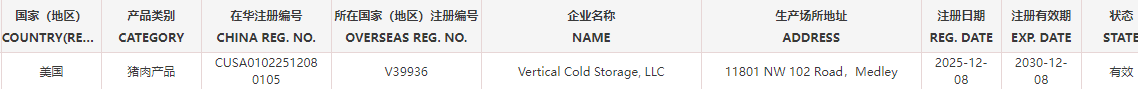 1.新增美国7家猪肉企业(注册编码为:V3322、V3037、47993、V3761、V39936、1380、748)自2025年12月8日(含)后生产的输华产品进口准入。
