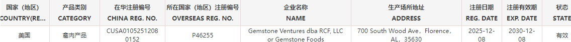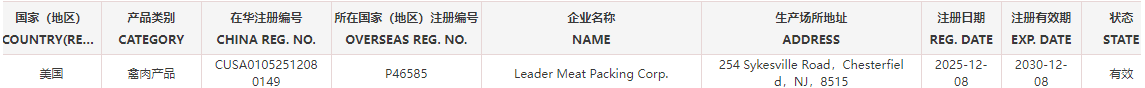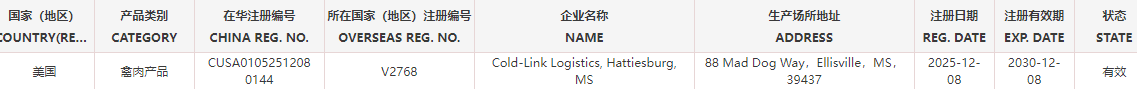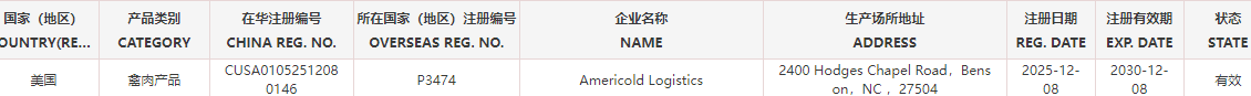 2.新增美国14家禽肉企业(注册编码为:P18881、V3761、P46585、P3474、V2546、V2768、P47993、P1380、V39936、P2894、P31690、V3322、P46255、V3037)自2025年12月8日(含)后生产的输华产品进口准入。