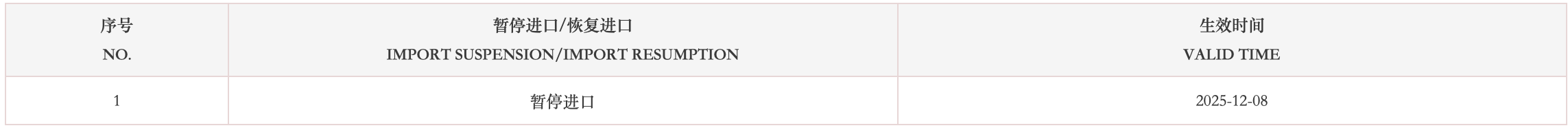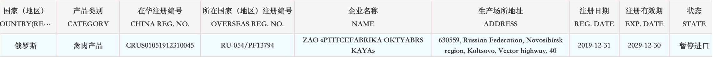 暂停受理俄罗斯1家禽肉企业(注册编码为:RU-054/PF13794)自2025年12月8日(含)起启运的输华产品进口申报。