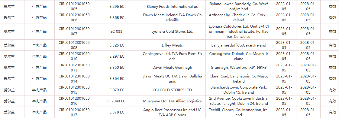 恢复爱尔兰23家牛肉产品(注册编码为:IE 300 EC、IE 344 EC、IE 354 EC、IE 512 EC、IE 351 EC、IE 290 EC、IE 2007 EC、IE 382 EC、IE 292 EC、IE 296 EC、IE 368 EC、EC 033、IE 325 EC、IE 297 EC、IE 350 EC、IE 364 EC、IE 079 EC、IE 2048 EC、IE 378 EC、IE 317 EC、IE 311 EC、IE 313 EC、IE 533 EC)自2026年1月12日(含)后生产的输华产品进口准入。