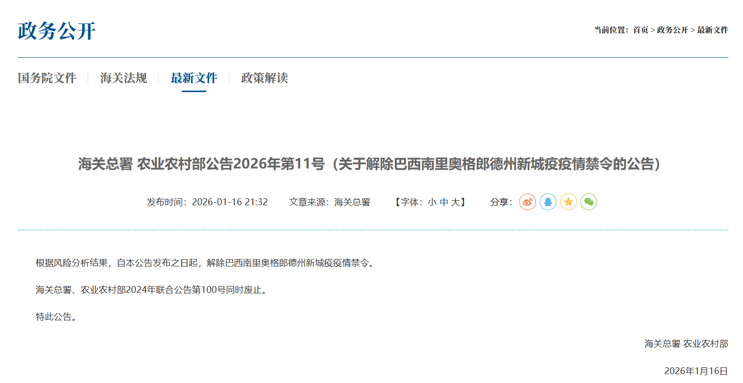 普悦 ·资讯 | 海关总署 农业农村部公告2026年第11号(关于解除巴西南里奥格郎德州新城疫疫情禁令的公告)