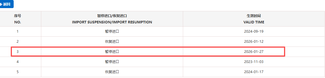 暂停受理爱尔兰23家牛肉企业(注册编码为:IE 300 EC、IE 344 EC、IE 354 EC、IE 512 EC、IE 351 EC、IE 290 EC、IE 2007 EC、IE 382 EC、IE 292 EC、IE 296 EC、IE 368 EC、EC 033、IE 325 EC、IE 297 EC、IE 350 EC、IE 364 EC、IE 079 EC、IE 2048 EC、IE 378 EC、IE 317 EC、IE 311 EC、IE 313 EC、IE 533 EC)自2026年1月27日(含)起启运的输华产品进口申报。