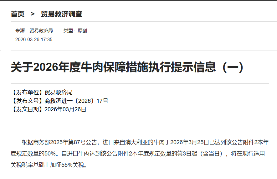 根据商务部2025年第87号公告,进口来自澳大利亚的牛肉于2026年3月25日已达到该公告附件2本年度规定数量的50%。自进口牛肉达到该公告附件2本年度规定数量的第3日起(含当日),将在现行适用关税税率基础上加征55%关税。
