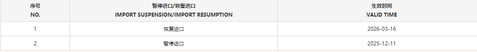 恢复法国2家禽肉产品(注册编码为:FR40.191.001CE、FR40.020.001CE)自2026年3月16日(含)后生产的输华产品进口准入。