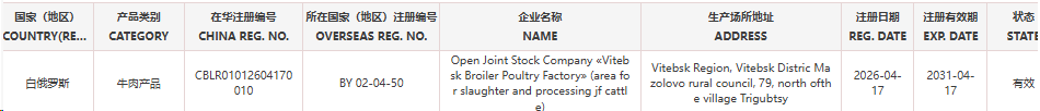 新增白俄罗斯1家牛肉企业(注册编码为:BY 02-04-50)自2026年4月17日(含)后生产的输华产品进口准入。