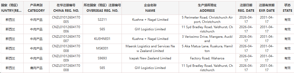 新增新西兰5家牛肉企业和1家鹿肉企业(注册编码为:S2211、S65、S9693、KUEHNE01、MSK001)自2026年4月17日(含)后生产的输华产品进口准入。