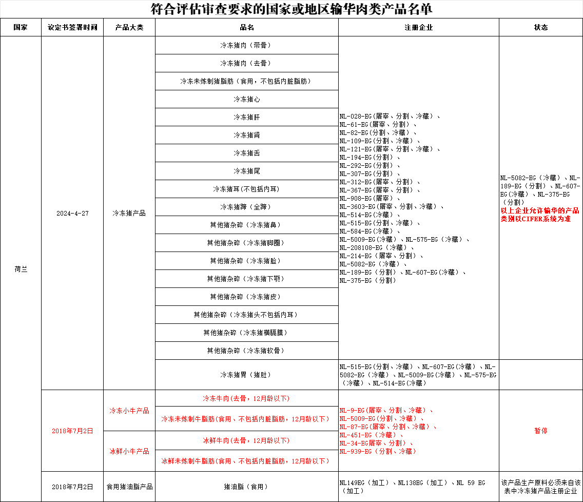 如下图,新增了荷兰冷冻猪产品的部分输华品类: