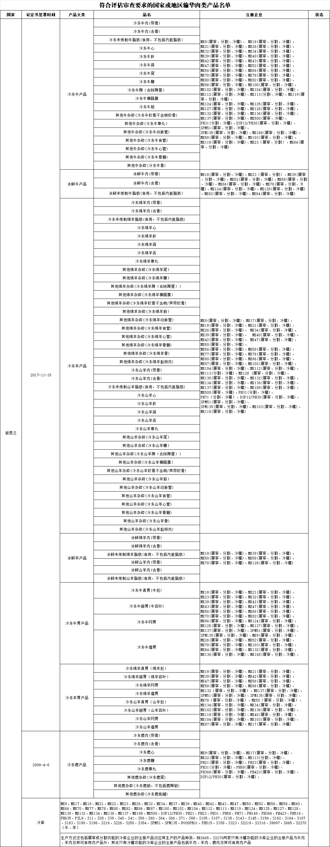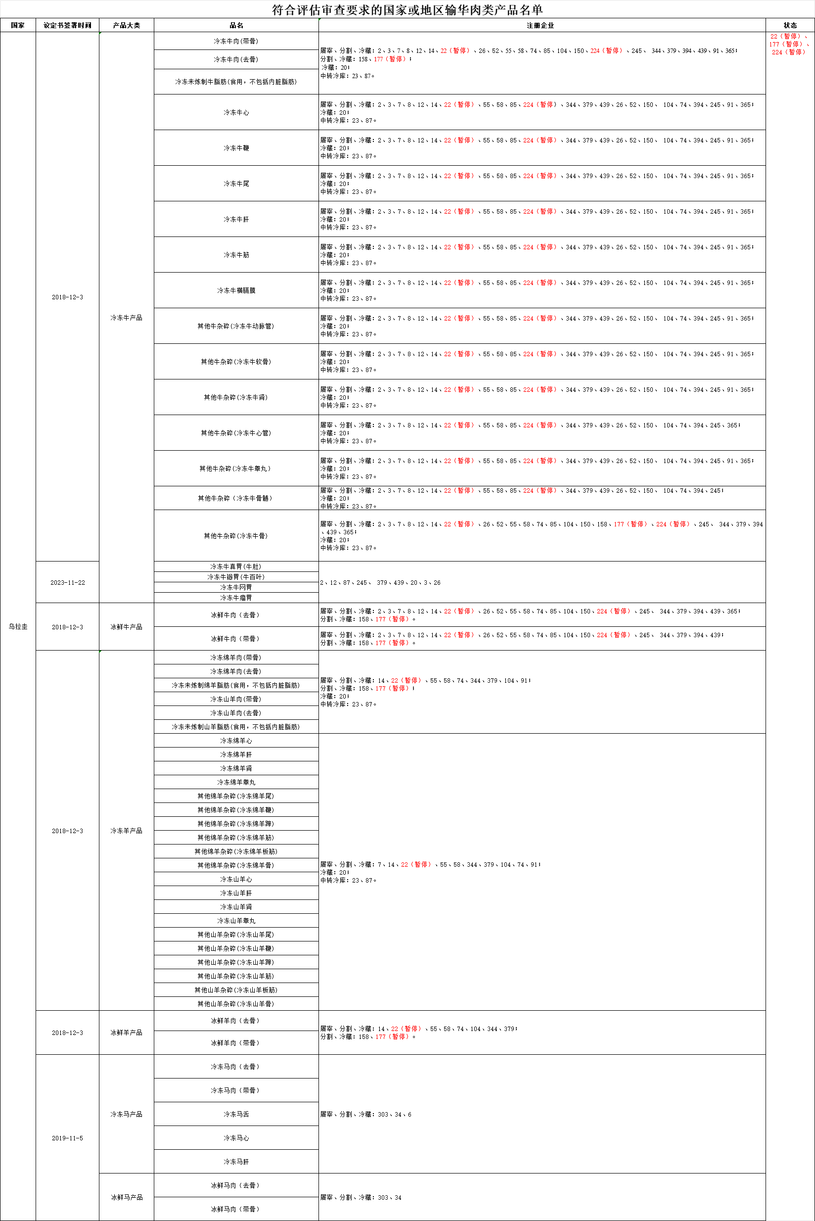 近日,海关总署更新《符合评估审查要求的国家或地区输华肉类产品名单》: