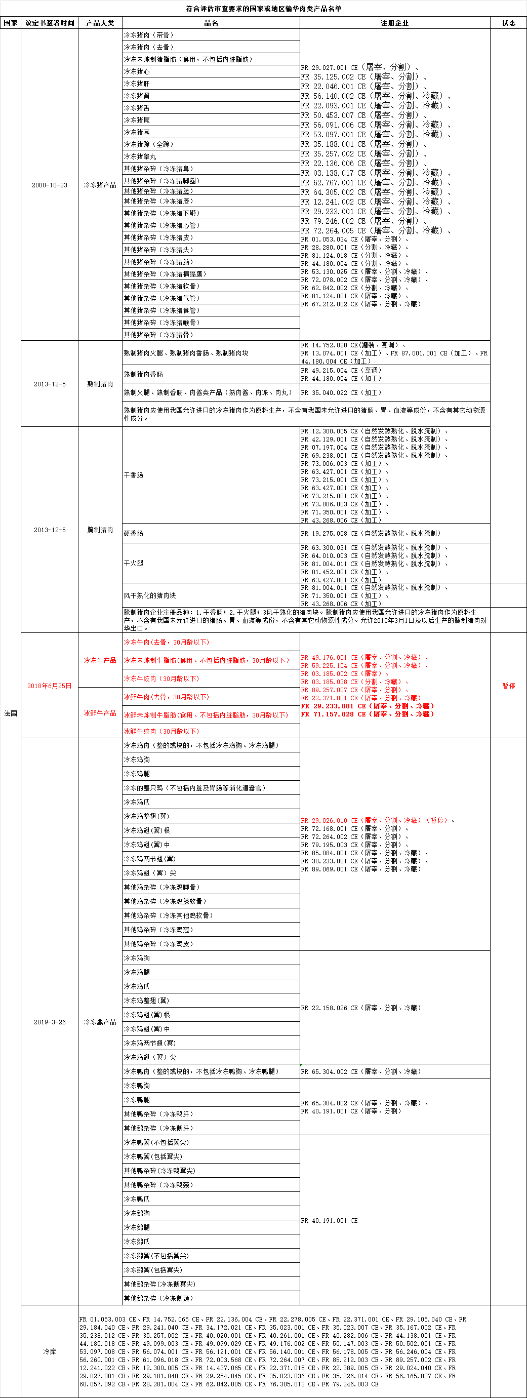 海关发布准入更新: 近日,海关总署更新《符合评估审查要求的国家或地区输华肉类产品名单》: 暂停巴西1家禽肉企业输华: SIF516 暂停法国1家禽肉企业输华: FR 29.026.010 CE 暂停波兰9家禽肉企业输华: 14170501 28620501 30053903 30210501 14023901 12190501 10160501 30051101 28153901