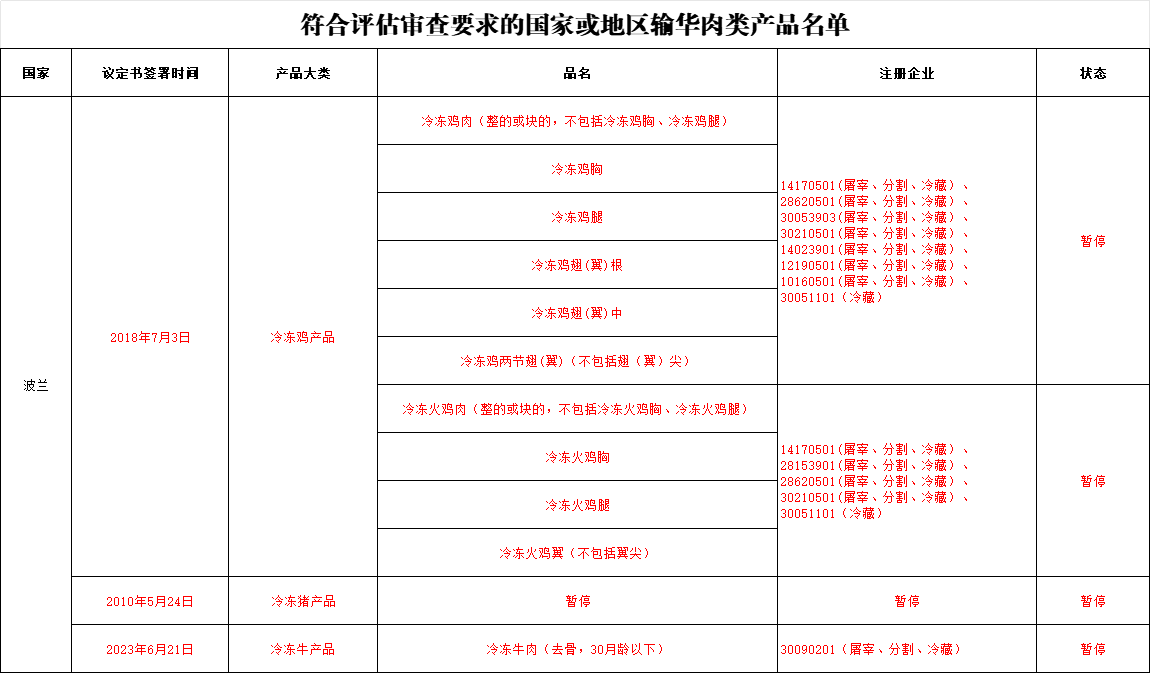 准入更新 | 暂停巴西、法国、波兰多家禽肉企业产品输华