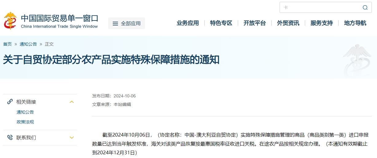 截至2024年10月06日,(协定名称:中国-澳大利亚自贸协定)实施特殊保障措施管理的商品(商品类别第一类)进口申报数量已达到当年触发标准,海关对该类产品恢复按最惠国税率征收进口关税。在途农产品按相关规定办理。(本通知有效期截止到2024年12月31日)