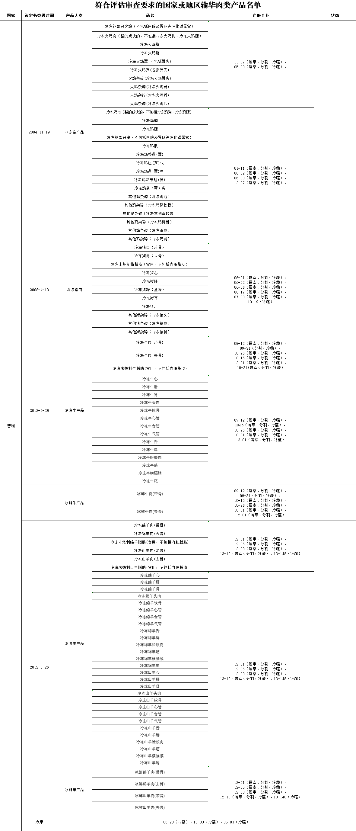 海关发布准入更新: 近日,海关总署更新《符合评估审查要求的国家或地区输华肉类产品名单》: 恢复智利注册编号为01-11、05-09、06-02、06-03、06-08、06-23、13-07、13-33的企业自2024年9月27日及之后生产的符合中国要求的禽肉产品对华出口。