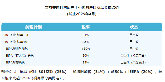 基于“301条款”,美国对原产于中国的进口商品普遍加征50%新关税。此次调整叠加现行多重关税,包括: