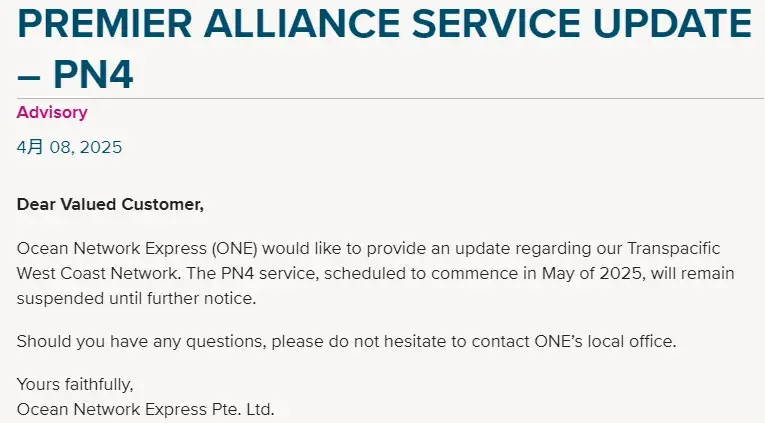 新收费适用于ONE所有航线,收费标准为50美元/TEU。(2025-4-23 17:06)