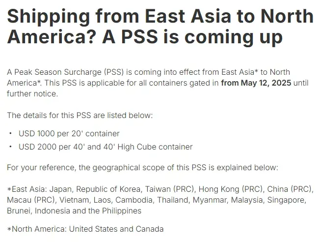 5月12日起,赫伯罗特将收取东亚至北美的旺季附加费(PSS)。