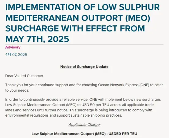 5月7日起,ONE将收取低硫地中海出口附加费(Low Sulphur Mediterranean Outport,MEO),旨在遵守最新的环境法规。