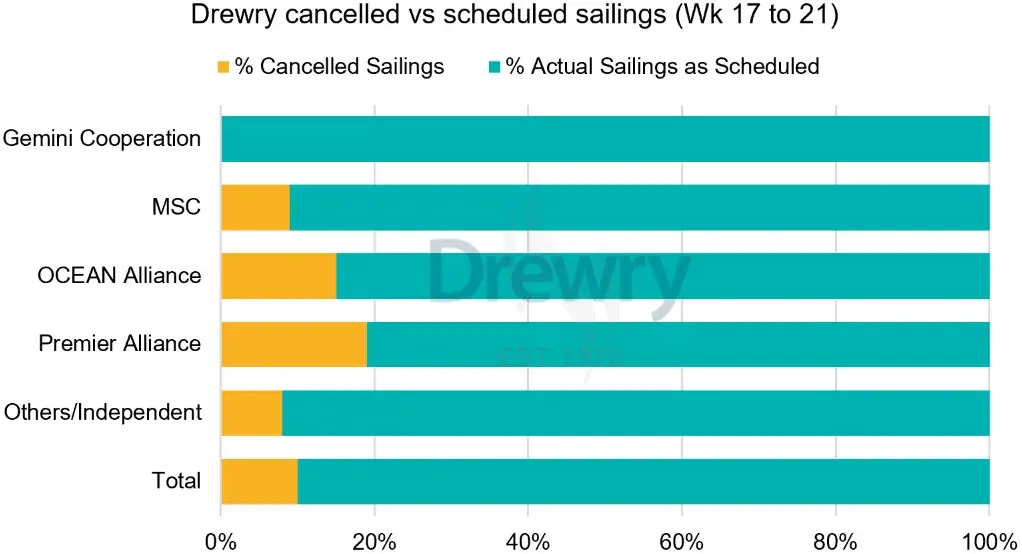 Drewry预测,在接下来的5周内,大部分取消的航次将影响到跨太平洋东行航线(56%),其次是亚洲-北欧和地中海(31%)和跨大西洋西行(14%)。