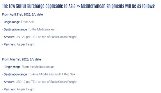 4月21日起,达飞向亚洲至地中海地区的货物,收取20美元/TEU的附加费;5月1日起, 向地中海地区至亚洲、中东和红海地区的货物,收取10美元/TEU的附加费。