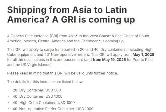 此外,5月1日起,赫伯罗特上调亚洲至拉丁美洲的综合费率上涨附加费(GRI),其中,波多黎各和美属维尔京群岛5月19日起实施。