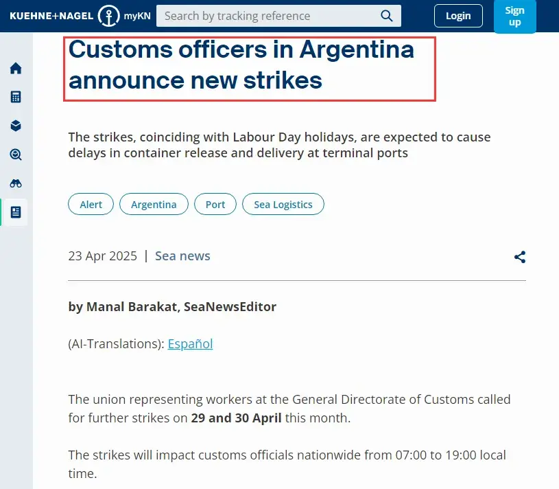 4月23日,德迅(Kuehne+Nagel)在其官网再次发布预警:阿根廷海关官员宣布新一轮罢工。代表海关总署工人的工会呼吁在本月29日和30日举行进一步罢工。出货阿根廷的货主货代请注意物流延误影响。