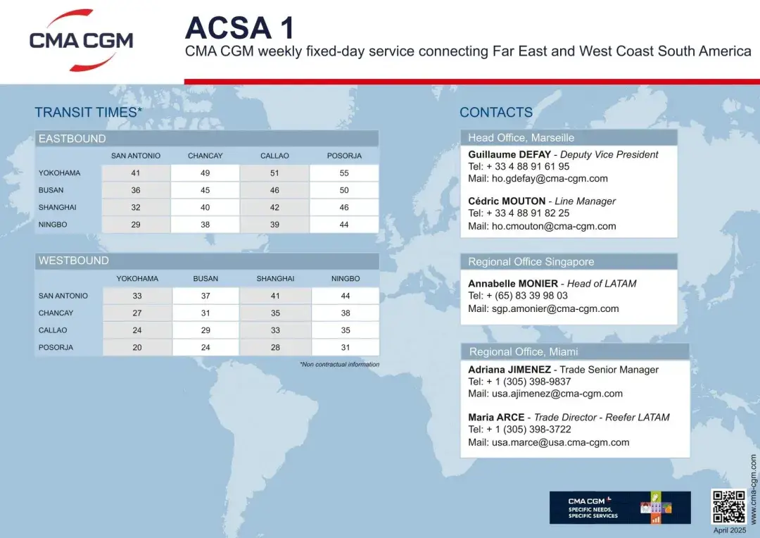 ACSA1航线将调整在南美西岸的航行方向(现改为自南向北航行),并新增圣安东尼奥港作为南美洲的首挂港。通过提供驶往这一重要港口的最短运输时效,形成独特的市场优势,将于2025年5月14日从釜山港首航。