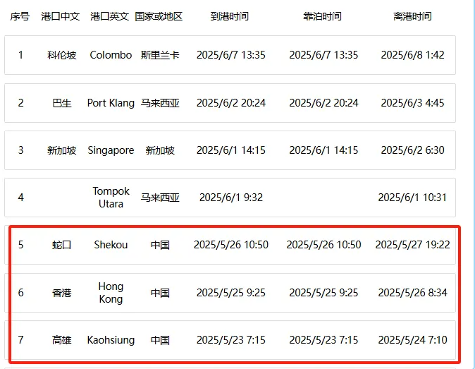 TP9航线由厦门出发的东向航次计划首航时间为6月24日,由长滩出发的西向航次首航时间为7月15日。(2025-6-12 17:20)