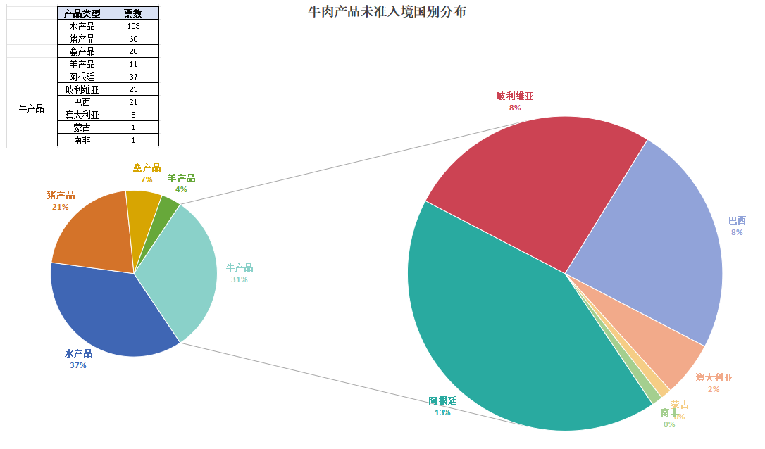 牛肉产品本月未准入境的国家主要包括阿根廷、玻利维亚、巴西、澳大利亚、蒙古、南非等6个国家。其中阿根廷有37票,货证不符占绝大多数;其次是玻利维亚,占据了23票,全部是由于氟佐隆不符合食品安全国家标准规定所致。巴西排在第三,占据了21票,氟佐隆不符合食品安全国家标准规定仍是主要问题。