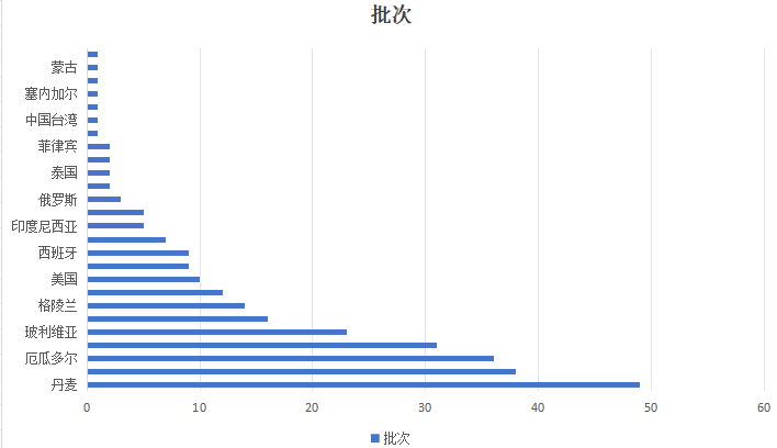 从统计数据来看,11月份未准入境的肉类及水产品食品在国家分布上呈现出显著的特点。其中,丹麦的产品批次最为突出,高达49批次,占据了未准入境产品的显著比例;紧随其后的是阿根廷,其未准入境的产品批次为38批次;厄瓜多尔、巴西排在第三、第四位,批次是36和31。