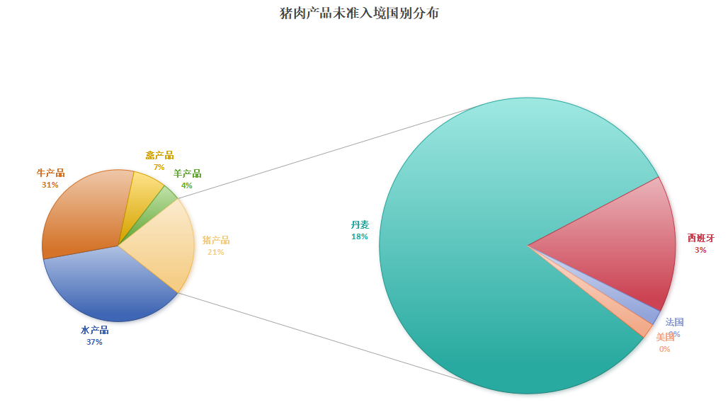 猪肉产品方面,其主要供应国家包括丹麦、西班牙、法国、美国。丹麦已连续两个月占据猪产品未准入境的第一名,其未准入境原因与前两个月相同,仍旧是由于检出动物疫病。