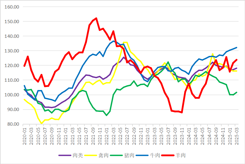 02.国际畜产品价格指数 (一)肉类 2025年3月份,FAO肉类价格指数小幅上涨,其中,猪肉、牛肉、羊肉价格上涨,禽肉肉价格微幅下跌。FAO肉类价格指数(基期为2014—2016年)2024年1月份降至108.86后反弹,最高涨至8月份122.02,2025年3月份为118.01,环比涨0.9%,同比涨2.7%。 具体看,猪肉方面:受欧盟、巴西猪肉价格影响,猪肉价格指数反弹至101.53,环比涨1.7%,同比跌10.3%(连续12个月低于上年同期)。禽肉方面:受巴西禽肉价格小幅下跌影响,禽肉价格指数116.09,环比持平,同比涨5.5%(连续9个月高于上年同期)。牛肉方面:受巴西、澳大利亚及美国牛肉价格影响,牛肉价格指数上涨至132.11,环比涨0.7%,同比涨8.2%(连续17个月高于上年同期)。羊肉方面:受澳大利亚、新西兰羊肉价格下跌影响,羊肉价格指数123.76,环比涨1.8%,同比涨26.6%(连续10个月高于上年同期)。 2020年以来全球肉类价格指数变化趋势图 (二)奶制品 3月份全球奶制品价格指数上涨。具体来看,2023年10月份开始震荡回升,2025年3月份为148.70,环比持平,同比涨19.9%。2月份全球全脂奶粉批发价格4485美元/吨,环比涨1.2%,同比涨12.6%。其中,美国全脂奶粉批发价格连续5个月下跌,为4768美元/吨,环比跌4.0%,同比涨3.1%;大洋洲全脂奶粉批发价格回升,为4125美元/吨,环比涨6.6%,同比涨21.5%;欧盟全脂奶粉批发价格连续5个月下跌,为4563美元/吨,环比涨2.1%,同比涨16.2%。按同期人民币汇率折算,2月份全球全脂奶粉批发价格32602元/吨。其中,美国、大洋洲和欧盟分别为34657元/吨、29985元/吨和33165元/吨。 来源:畜牧产业经济观察 发布时间:2025年4月16日 09点17分