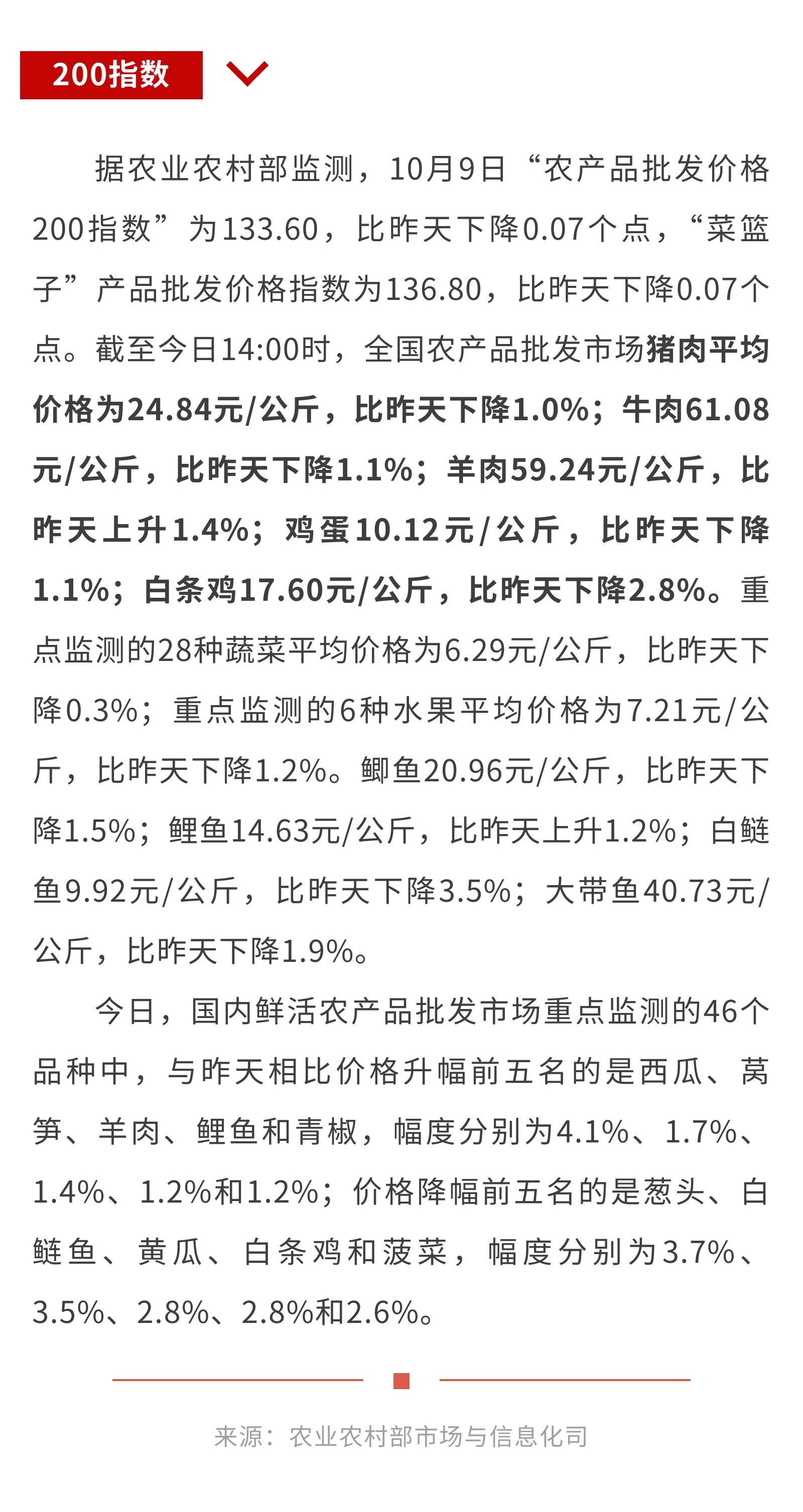 10月9日:“农产品批发价格200指数”比昨天下降0.07个点